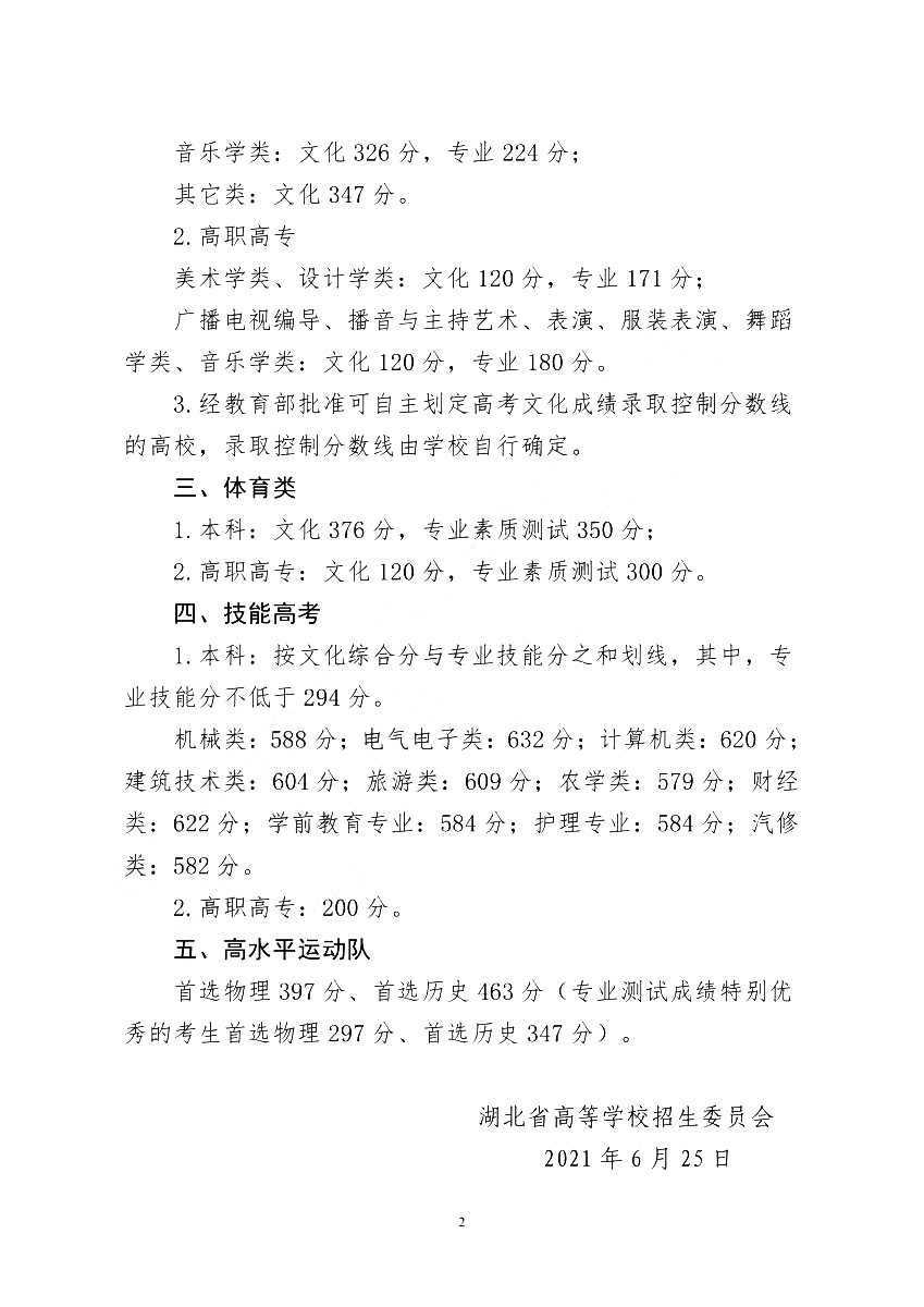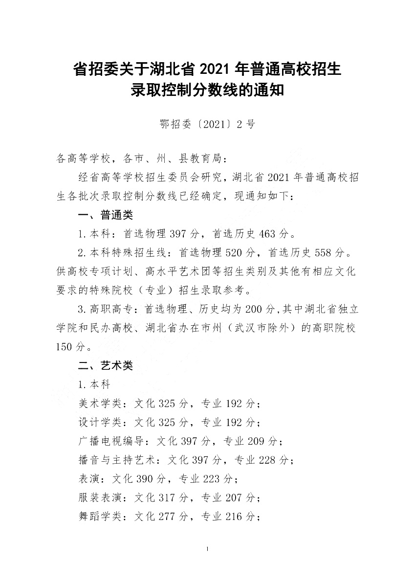 关于湖北省2021年普通高校招生录取控制分数线的通知