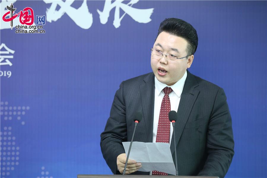 6月5日,2019国研智谷“三新经济”服务与合作发布会在北京举行。图为中国发展出版社社长、国研智库董事长包月阳致辞。
